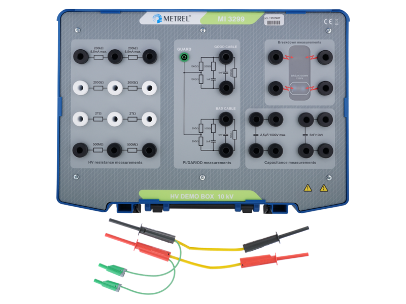 El MI 3299 High voltage Demonstration Box 10 kV ha sido desarrollado con fines de demostración para diagnósticos de aislamiento de alta tensión. Simula el típico aislamiento eléctrico que se suele encontar en el entorno industrial. Está equipado con resistencias de alta calidad a diferentes rangos, condensadores de alta tensión y una función de descarga que simula un fenómeno de descarga de gases. Además, pueden realizarse ejercicios de demostración sobre las mediciones de índice de polarización (IP), descarga dieléctrica (DD) y relación de absorción dieléctrica (DAR). Al estar equipado con todas estas características el kit de demostración resulta muy adecuado para la calibración básica de equipos de medición de resistencia de aislamiento de alto voltaje en DC.